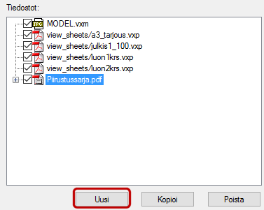 - Voit lisätä useita tiedostoja kerralla PDF-kirjaan käyttämällä tiedostonimessä jokerimerkkiä *. Voit esimerkiksi lisätä kaikki ulkoseinäelementit PDF-kirjaan kirjoittamalla Lisää tiedosto -keskusteluikkunan tekstikenttään PANEL.U*.vxp tai se/SE_U*.vxp (riippuen elementtikuvatiedostojen nimeämiskäytännöstä ja tallennuspaikasta).