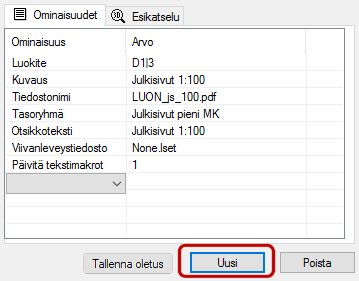 - Lisää dokumentille uusi ominaisuus napsauttamalla Uusi. Valitse ominaisuus luettelosta,