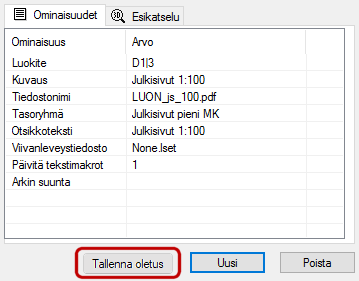 - Voit tallentaa ominaisuusryhmän oletukseksi napsauttamalla Tallenna oletus