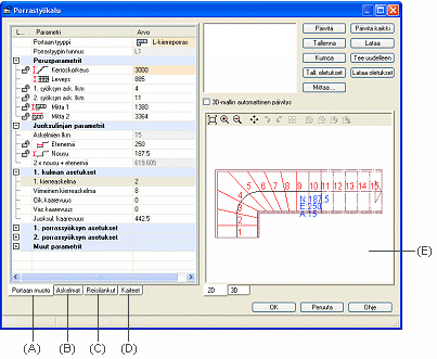 Jos lisäät porrasta, valitse portaan tyyppi ja parametrit sekä askelmien, reisilankkujen ja kaiteen parametrit Porrastyökalu-keskusteluikkunassa. Jos lisäät kaidetta, voit valita keskusteluikkunassa vain kaiteen parametrit. Parametrien arvot on keskusteluikkunassa merkitty seuraavin värein: