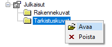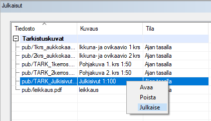 Toiminto avaa julkaistun setin Julkaisut-keskusteluikkunaan. Voit avata yksittäisen julkaistun dokumentin valitsemalla dokumentin ja hiiren oikealla avautuvasta valikosta Avaa. Voit julkaista valitun dokumentin uudelleen valitsemalla Julkaise.