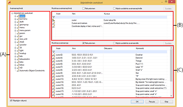 pääavainsanaryhmät on nimetty vanhojen asetusarvotiedostojen mukaan.