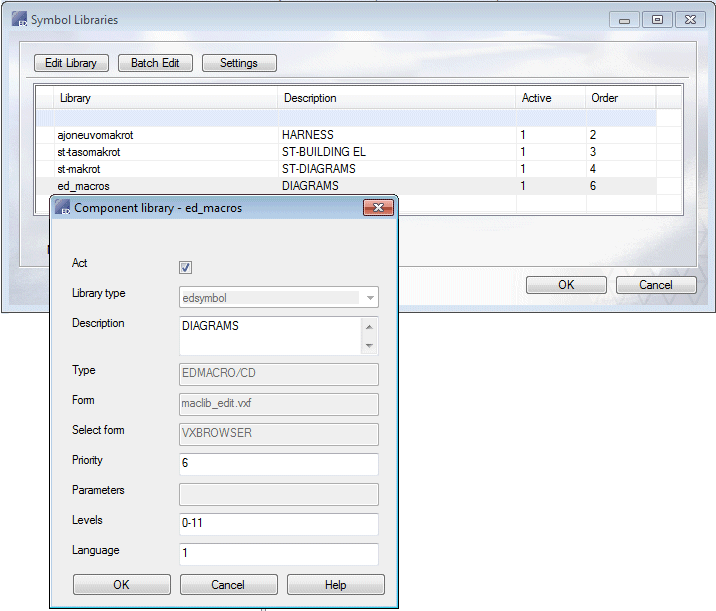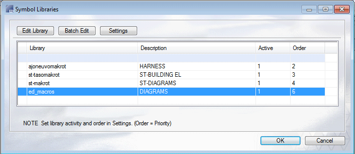 Set the order and activity of the libraries using the Settings function. In the Symbol Library, the order of symbols is determined by the Priority (Order) field.