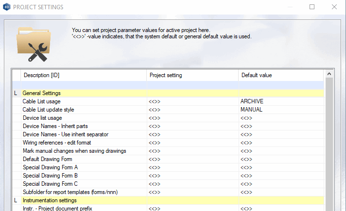 2. The software opens Project settings dialog box, where you can define fields Description (ID), Project setting and Default value.