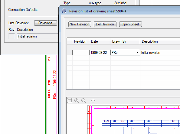 The function adds marking to a sheet revision already opened to a drawing. You have to add revision to the drawing first. The marking describes that changes are made to this revision of the sheet. As a default, the revision inherits the description of the drawing revision. Usually, this is replaced as description of the changes on the sheet in question. When closing the revision list, the new revision marking is updated on the sheet archives card.
