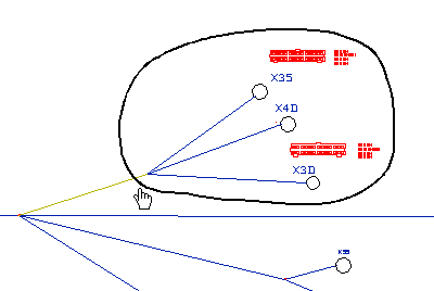 The cable branch to be moved is circled and the stretching cable route is pointed in the picture. Click the cable route with a special pointer, that is illustrated in the picture. A cross pointer, that moves along with the cable allows you to create curves and keeps the length correct.