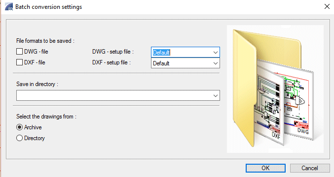 Convert several drawings at the same time to DWG files. The function uses DWG converter, which writes and reads DWG files. The converter's properties are defined in the setup file. Before starting file conversions, you can select the setup file. Setup files are in the Vertex folder setup/DWG.