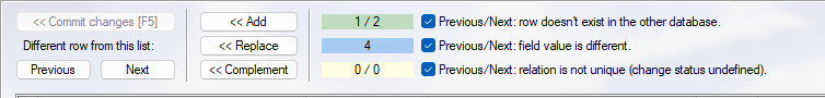 - Yellow background: the relation is not unique. In one of the databases, there is more than one row with the same value in the relation field. In this case, the status of change is undefined - the contents of the fields are not compared.