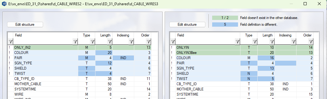 - Blue background: number of fields where the field definition (type, length, indexing, order) is different in database Db1 and Db2. In the list view, the field row is highlighted in light blue, the different definition in darker blue.