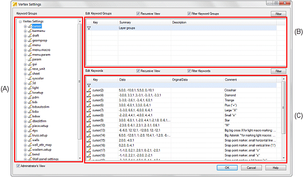 The keyword groups are displayed in the tree view (A) of the dialog box. When you select a
