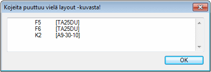 Näet luettelon komponenteista, jotka puuttuvat Layout-kuvasta.