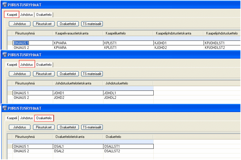 - Kaapelijohdotustietokanta on lista kaapelivaraustietokannan kaapeleista ja niiden johtimista. Kaapelitunnukset lisätään piirustukseen kaapelijohdotustietokannasta, joka pitää kirjaa siitä, mitkä kaapeleiden johtimista on käytetty ja mihin ne kytketty.