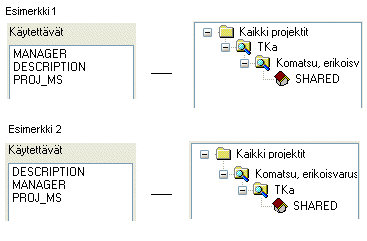 - Luettelossa esitetään kaikki projektiarkistotietokannan kenttien nimet.