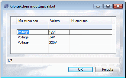 Esimerkkinä, jos tekstiosassa käytetään muuttuvaa osaa Voltage jännitearvolle, lisää taulukkoon rivejä, joissa Muuttuva osa -kentässä esiintyy arvo Voltage, ja Valinta-kentässä esiintyy haluttu jännitteen arvo. Voit lisätä huomioita.