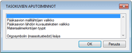 Valikossa on seuraavat toiminnot: Tasokuvan origopisteen lisäys: Origopisteessä toimii tasokuvan referenssipisteenä. Lisäksi materiaalien keruussa tarvittavat perustiedot voidaan antaa origosymbolin attribuuttitietona.