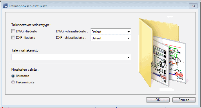 Vertexistä vietävät piirustukset valitset Arkistosta tai Hakemistosta. Valitse vietävät piirustukset, ja valitse kohdekansio, johon DWG-tiedostot tallentuvat.