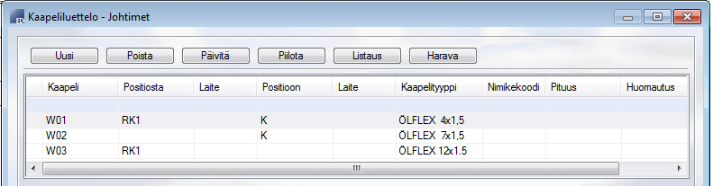 Avautuu kaksiosainen tietokantanäyttö: Kaapeliluettelo ja Johtimet. Käytössä ovat yleiset tietokantatoiminnot sekä näyttöjen painikkeet.