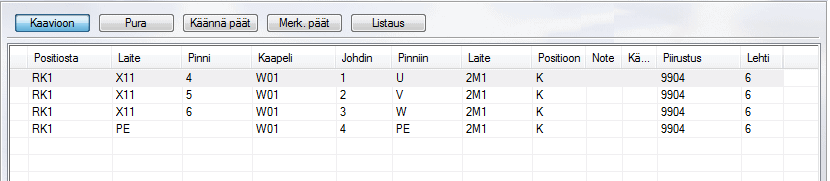 - Kaapeleiden johtimien kytkennöistä napsauttamalla painiketta Listaus (Johtimet, alapuolella).