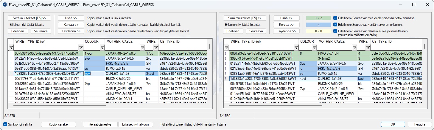 - Kun valitset rivin, vastaava rivi tulee valituksi myös toisessa tietokannassa, jos Synkronoi