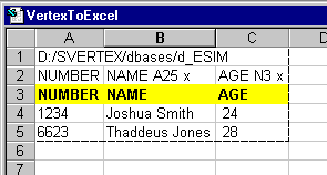 Näytöllä selattavana oleva osa Vertex-tietokantaa siirretään Excel-tauluksi. Asettelematon siirto Exceliin siirtää tietokannan kaikki kentät määrittelyjärjestyksessä kunkin omaan sarakkeeseensa Excelin riviltä 4 alkaen. Taulukon ensimmäiselle riville talletetaan tietokannan hakupolku ja toiselle riville kunkin sarakkeen määrittely Excel> VERTEX -siirtoa varten. Rivit 1 ja 2 piilotetaan näkyvistä siirron jälkeen. Riville 3 siirto lisää kunkin kentän nimen otsikoksi. (Ks. kuva alla).