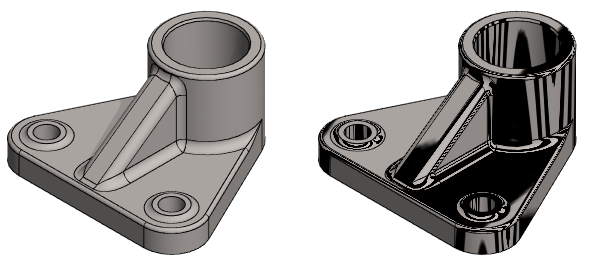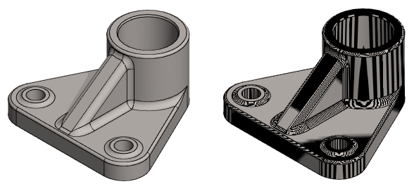 Zebra shading is used when examining the mutual continuity of adjacent surfaces. The shading is drawn more precisely when you zoom in closer to the model. Zebra shading will change to apply to all models on the Vertex desktop at once.