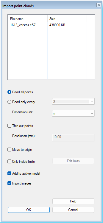 - Upon import, you can remove overlapping or other nearby points with the desired precision. Instead of deleting every nth point, this thinning method uses a cube with one side of the length of which is the value entered as a resolution. As a result, one point of the point cloud remains inside the cube. So this is an alternative or concurrent thinning to the Read only every n point option. If the file imported in e57 format contains individual subclouds, thinning is applied to all of them at the same time.