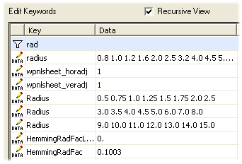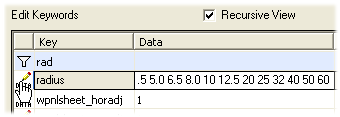 In this example, you will find the radius keyword among all keywords. The keyword defines the options for the list from which you can select the radius of a rounding between two lines. When you are searching for a keyword among all keywords, the search results may contain several keywords with the same name. You can deduce which is the right keyword by checking each keyword's keyword group and the group's description text.