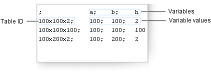 The dimension table data is saved in an ASCII file. The following data is saved in the file: the names of the dimension constraint variables (the contents of the Formula field), table IDs and the values of the variables defined for the table IDs.