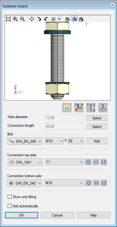. - Please note: Normally, the program will only suggest screws that fit the selected hole (smaller in diameter than the hole and larger in length). However, you can skip this by selecting the "Show only fitting" checkbox at the bottom of the dialog box.