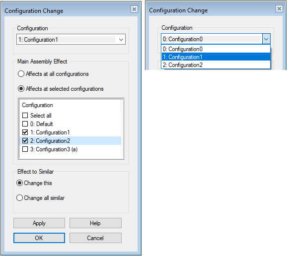 Affects at selected configurations if you want to select the main assembly configurations in which the selected part configuration affects.- Then select the main assembly configurations using the checkboxes