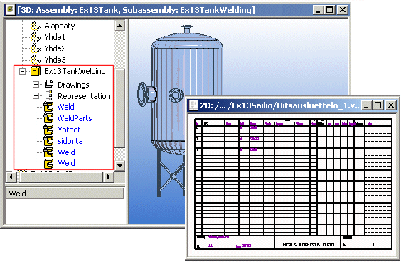 - If a drawing has been created of the welding assembly, you can also select Collect parts list in the drawing and Welds as the output format. The welding list opens in the 2D window, and you can save it as a Vertex drawing.