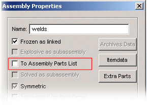- To prevent the weld subassemblies from being included in the Bills of Materials of the main assemblies, leave the To Assembly Parts List checkbox empty in the weld assembly properties.