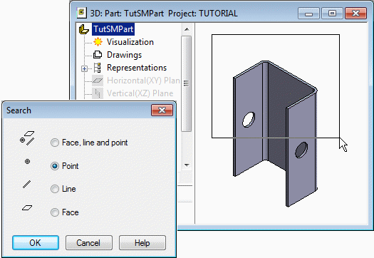 When a part model is in the working window, you can select faces, points and lines by indicating an area of the model. The elements that are within the area entirely will be selected.