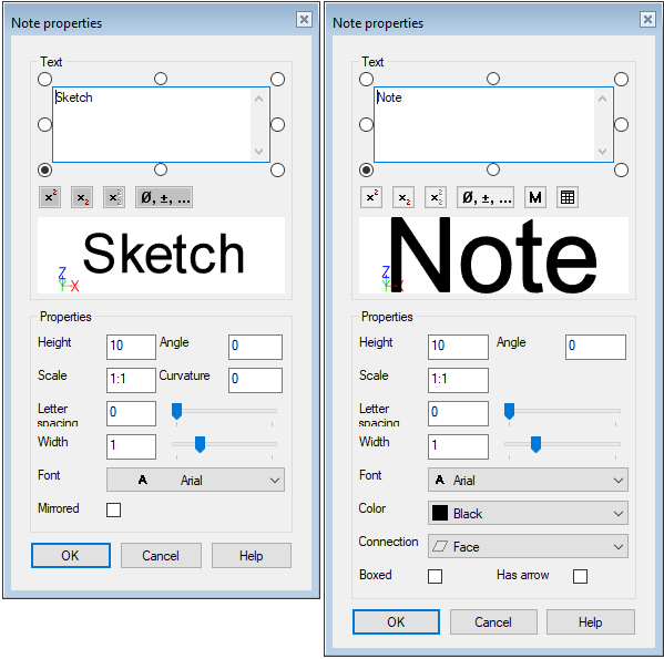 Define the properties of a model annotation or part model sketch text. The dialog box is related to the functions