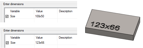 - In the example, #Size!100x50# is written in the text of the sketch, and a cutout extrusion has been created of this.