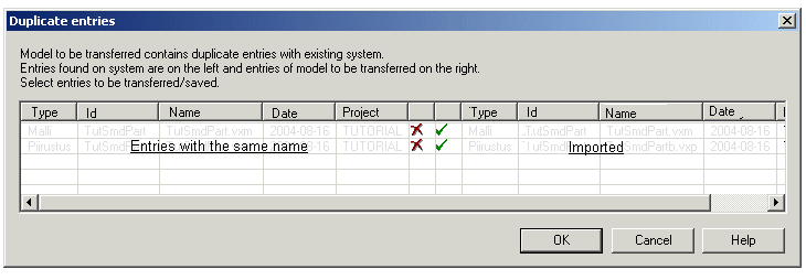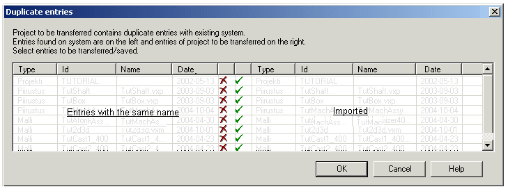 If a project label, archive document or file with the same name as one of the imported project already exists in Vertex, you can select which project's entries are imported. A dialog box will open where you can select imported files.