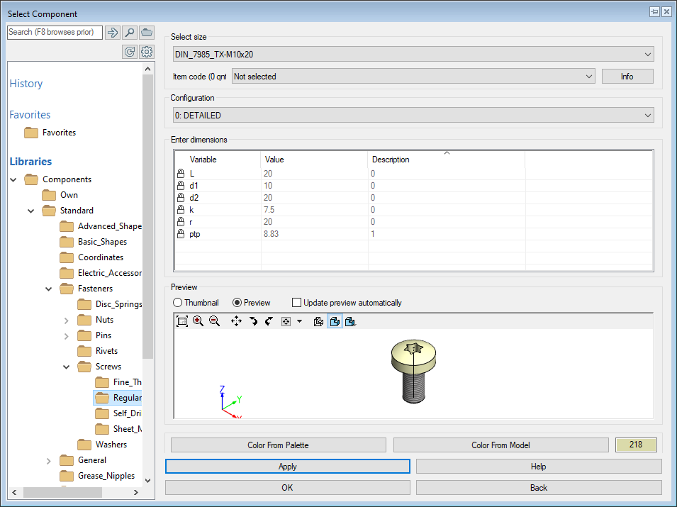 Preview is selected, the geometry will be varied as soon as you select a dimension table row. - Color from palette