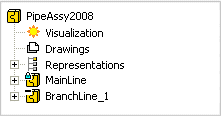 - MainLine (the main line) and BranchLine_1 (the branch line) added to the assembly are local pipe assemblies.