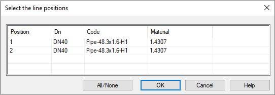 - The program opens the BENDING DATA OF BENDED PIPES dialog box and lists the pipe data from the selected lines, i.e. the positions.