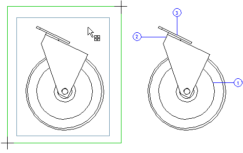 Define the part number properties in the dialog box, select the projection to be numbered from the drawing, and select the area inside which the part numbers will be positioned.
