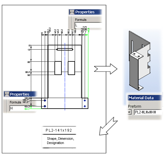 - Refer to the variable name in the part properties and material data. If the variable name in the Formula field of the dimension properties is A, for example, you can refer to the variable value in the material data by adding hashes to both sides of the variable name: #A#. You can add several variables to the same field, e.g. #A#x#B#x#C#, where the variables A, B and C are named dimensions.