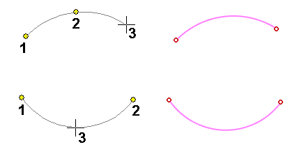 - The third point of the arc may be either in between the first two points or outside of them. Move the cursor over the second point to change the position of the third point.