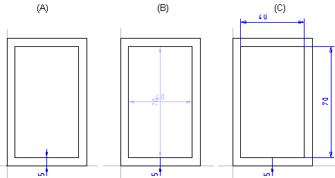 Sketch a rectangle and add an offset line to it at a distance of 5 mm (A). The Offset function will automatically add the Distance constraint between the lines and the Equal Distance constraint between other lines.