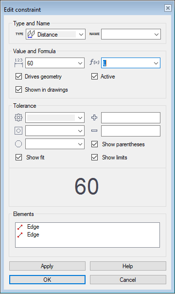 - Defines the value of the distance, angle, or radius, depending on which constraint type you are defining. This is a numerical value and it must be greater than 0. You can also enter the value as a numeric calculation, such as 360/8. The calculations available are the same as those in the Formula field.