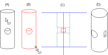 Continue modeling the cylinder by adding a new sketch on face (A). As you move the cursor, while holding down the Alt key, along the edge of the cylindrical face (B), the angle value changes in the dialog box. Define an exact angle value of 90 in the dialog box. Draw the sketch (C), and select the material cutout extrusion. Now the two features are at a 90-degree angle to each other (D).