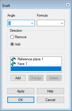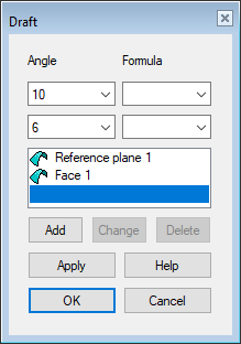 - A single angle value is asked if the surface of a part is selected as the reference plane. Two angle values are asked if an auxiliary plane or cross-section is selected as the reference plane.