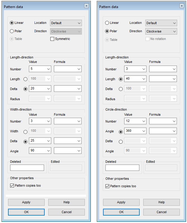 Select a linear or polar feature pattern. The dialog box adapts to the above choice.
