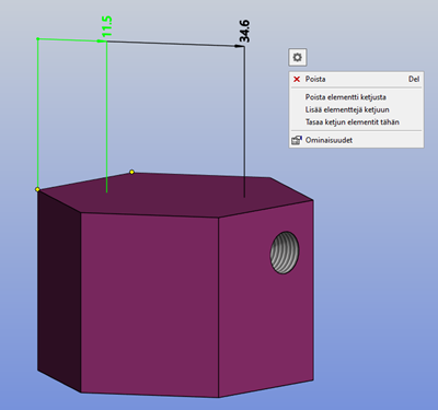 Continuous baseline dimensioning provides additional chain management functions. You can find the functions in the right-click menu when you select Continuous Baseline Dimension from the Length Dimension menu and an MBD element from the model.
