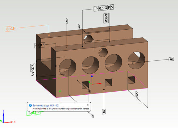 - Location tolerances always require a dimension, otherwise there will be a warning. The same applies to symmetry.
