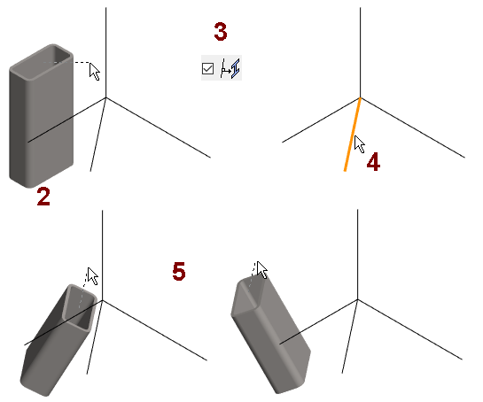 This function determines the sweep plane based on a straight line selected from a model and its normal. The cursor is constrained to the sweep plane. Profile sweep is performed in the sweep plane when a point has been selected as the position for the cross-section.